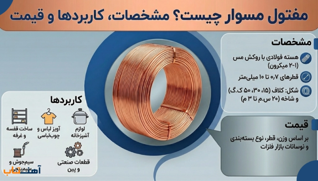 مفتول مسوار نوعی سیم فلزی است که از آلیاژ آهن با پوشش یا ترکیب مس ساخته میشود. این مفتول در قطرهای متنوع، حدود ۰٫۷ تا ۸ میلیمتر تولید میشود و به دلیل وجود عناصر آلیاژی مانند قلع، آنتیموان، گوگرد، فسفر، کربن، منگنز و سیلیسیوم، از استحکام و دوام بالایی برخوردار است. در میان این عناصر، قلع و آنتیموان مهمترین نقش را در افزایش مقاومت مکانیکی و طول عمر مفتول مسوار ایفا میکنند. همین موضوع باعث شده این محصول در صنایع مختلف، از تولید قطعات صنعتی تا کاربردهای تزئینی، جایگاه ویژهای داشته باشد.